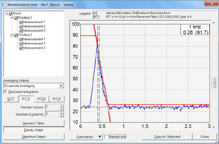 Multiple microphones may be set up in different parts of a room using a single or multiple source location. All locations may be analysed using the same numbers of averages and statistical analysis, in accordance with the standards. Use of multiple simultaneous microphones may be more efficient and controlled than using consecutive single measurement microphones at multiple locations in a theatre or large space.